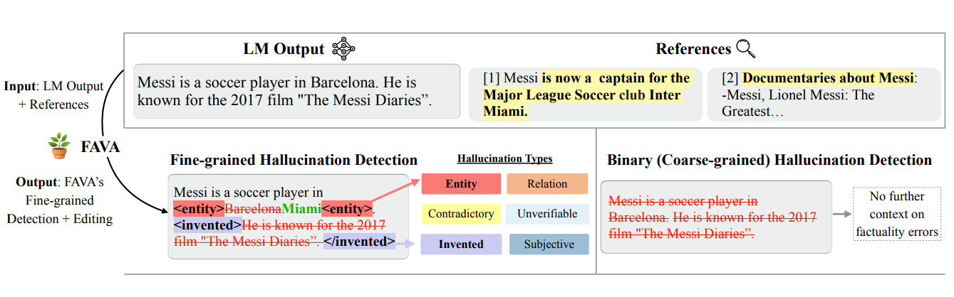 A more detailed approach is needed to go beyond labeling entire statements as incorrect. Consider the sentence, Messi is a soccer player in Barcelona. He is known for the 2017 film The Messi Diaries. A binary system might flag the statement as false without explaining why. Fine-grained detection, on the other hand, pinpoints specific issues: the incorrect location (Barcelona should be Miami) and the invented claim about a non-existent film.
