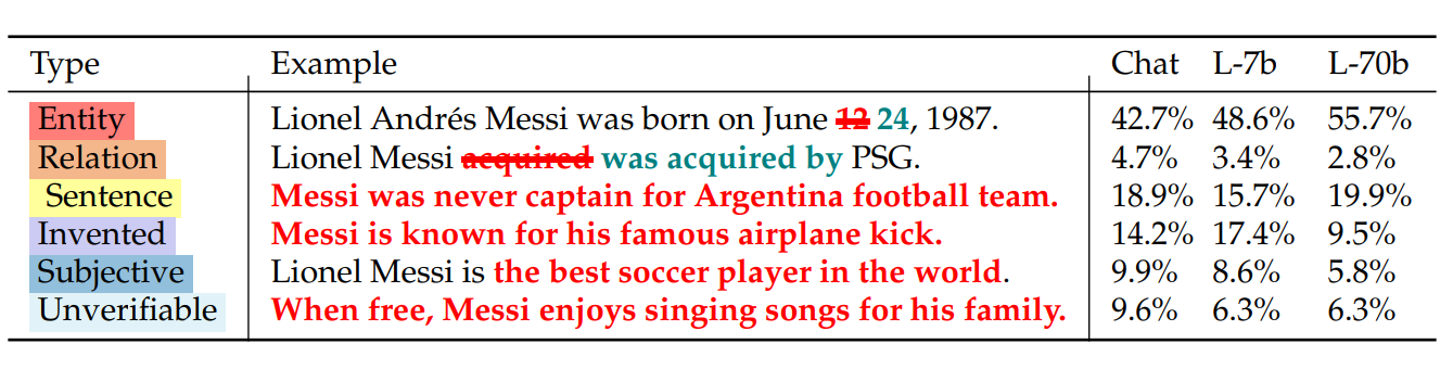 Detecting and Correcting ErrorsUsing the evidence retrieved, FAVA identifies specific hallucinations in the input text. It categorizes these errors based on the taxonomy, flagging them as entity errors, invented claims, or unverifiable statements, among others. The editing component then proposes corrections informed by the retrieved evidence. For instance, in the earlier example, FAVA would detect that Miami is incorrect and replace it with the verified fact, Rosario, Argentina.
