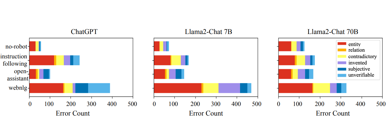 The dataset also uncovers trends in the types of errors models generate. The graph below illustrates how hallucinations are distributed across different models and datasets. Entity errors are common across all models, while errors like fabricated information or unverifiable claims show more variability.