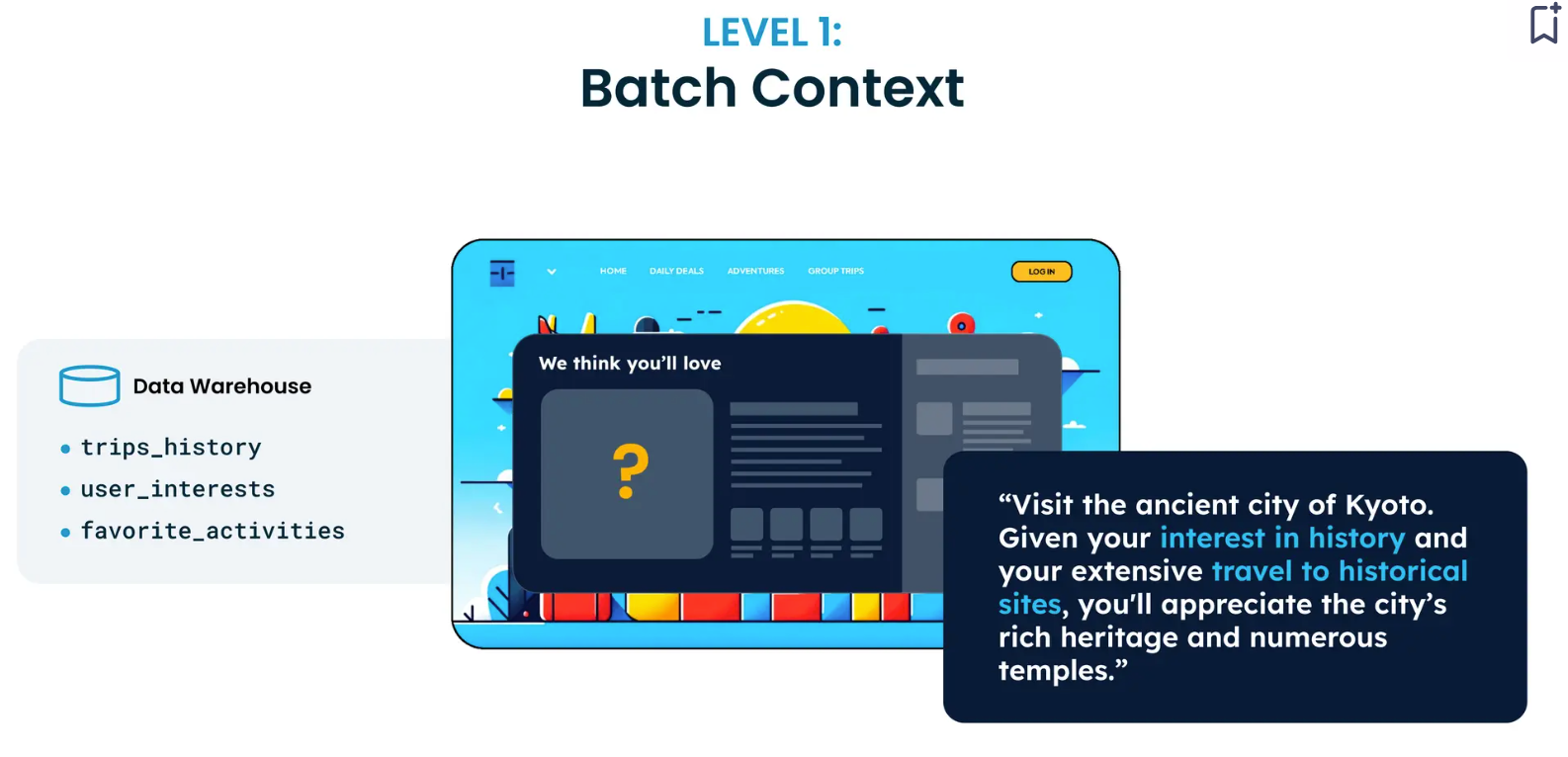 The next level provides historical data, such as trip history, favorite activities, etc. Implementing this level is challenging as you must build pipelines to retrieve and join data from different warehouses or data lakes. You would also need to create historical evaluation datasets for benchmarking and development.