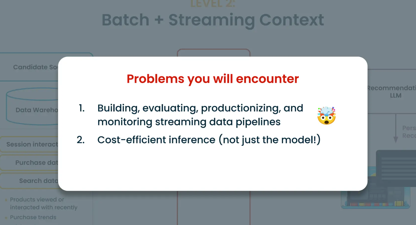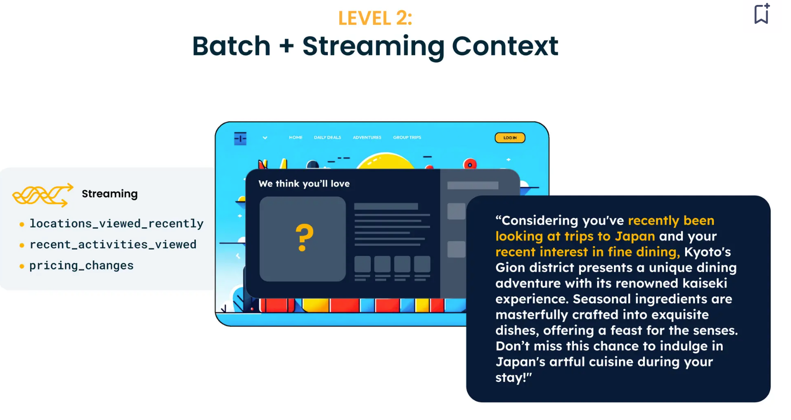 Tecton simplifies building streaming context. For example, it starts with a simple context definition: "In the past hour, what topics did the user watch a video about ?”. This can be coded into the platform's Python SDK. We can test it, deploy it to production, and use it in real time. The recommendation at this stage is significantly better than the previous one. For example, if the user has been searching for flights to Japan and loves fine dining, the LLM will curate a dining experience in Japan.