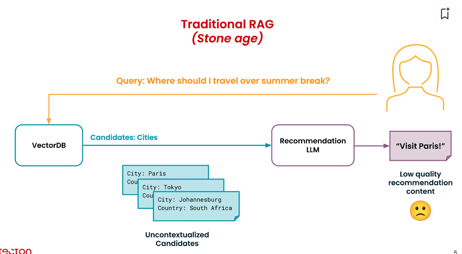 Though effective in addressing hallucinations, a standard RAG system falls short in use cases like providing hyper-personalized recommendations. This is because the top-k candidates retrieved might not have more personalized context on the particular user's likes and dislikes.