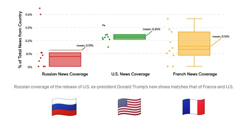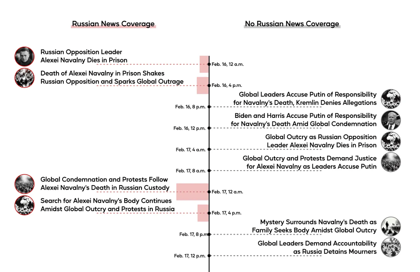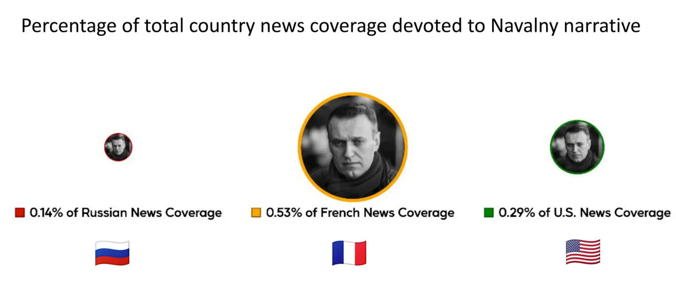 We measure how much coverage each country gave to report the death of Navalny. Robert chooses Russian, French, and US News coverage to compare the differences. It was observed that 0.5% of French news coverage was devoted to Navalny, whereas Russia has only 0.14%.