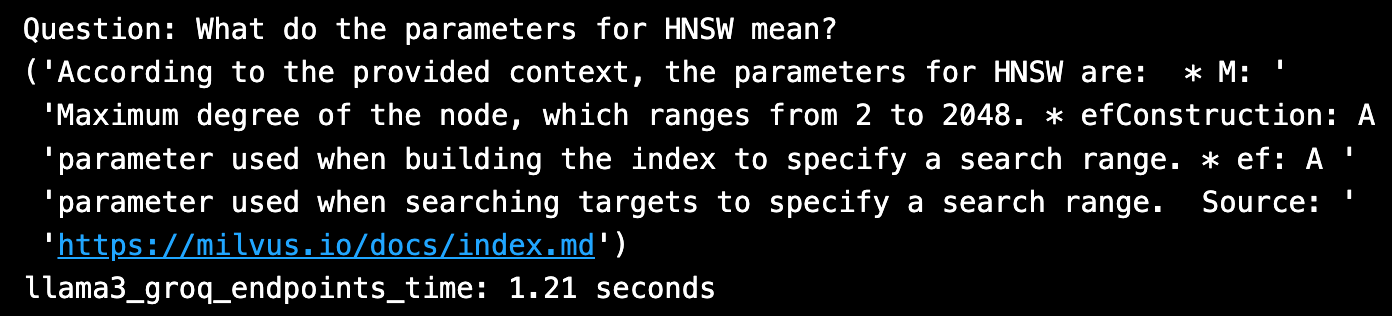 Sources: 1.[ https://milvus.io/docs/index.md](https://milvus.io/docs/index.md) 2. [https://milvus.io/docs/index.md](https://milvus.io/docs/index.md)'` | 3.57 | Free playground | 0.79 | |