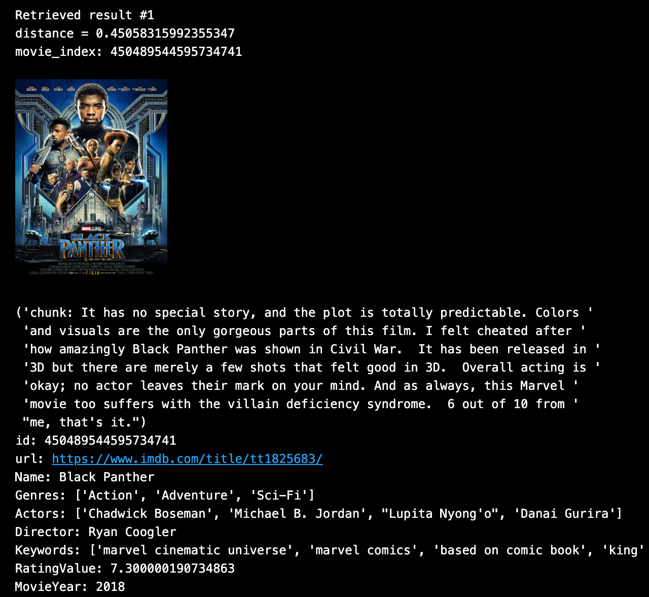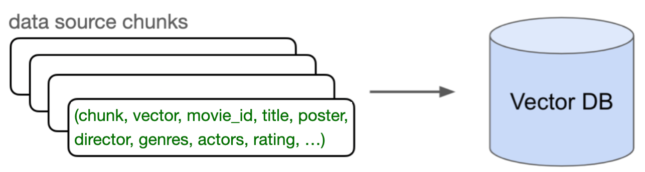 Each “row” represents a movie review chunk of text, its vector representation, and metadata such as movie_id, movie title, poster link, genres, and actors.