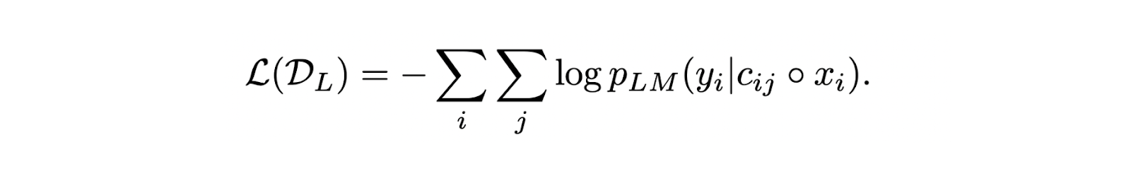 Now that we have a prompt consisting of an input query and a retrieved context, we can fine-tune the LLM using standard next-token prediction by optimizing the following loss function: