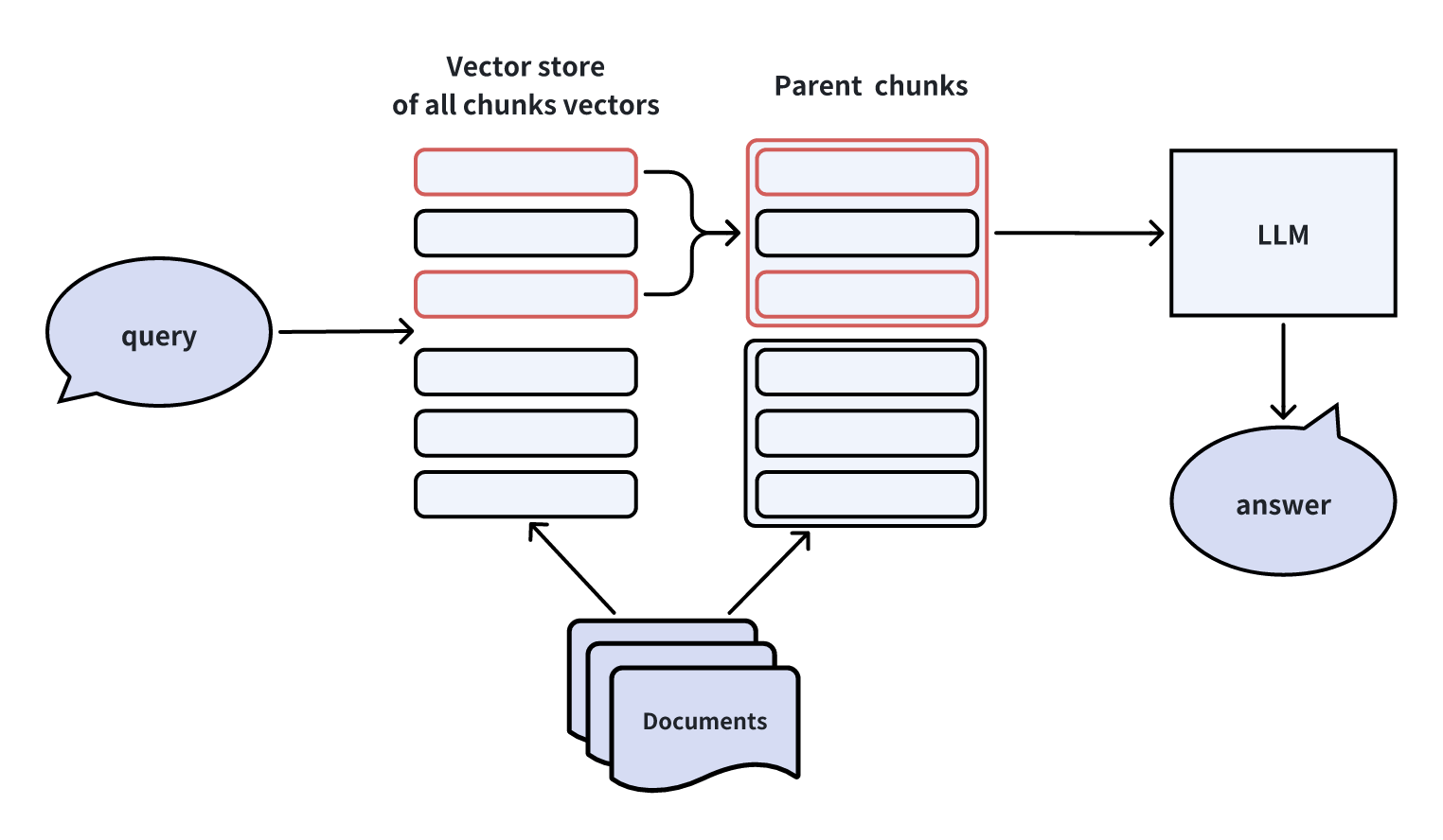 The diagram below shows the most straightforward RAG pipeline. First, document chunks are loaded into a vector store (such as Milvus or Zilliz cloud). Then, the vector store retrieves the Top-K most relevant chunks related to the query. These relevant chunks are then injected into the LLM's context prompt, and finally, the LLM returns the final answer.